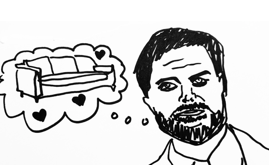 It could never be. It never would be. How could a man– powerful, navy-suited, chestnut-haired– love Beth? How could a man love a couch? And a thirty year old couch at that. Beth was no longer spry. Her insides were aged with rust, her outsides oiled from butts of the past. Fart molecules were surely trapped in her crevices. She was nothing compared to him. No beating heart lay in her chest, and no tunnel lay between her legs.
